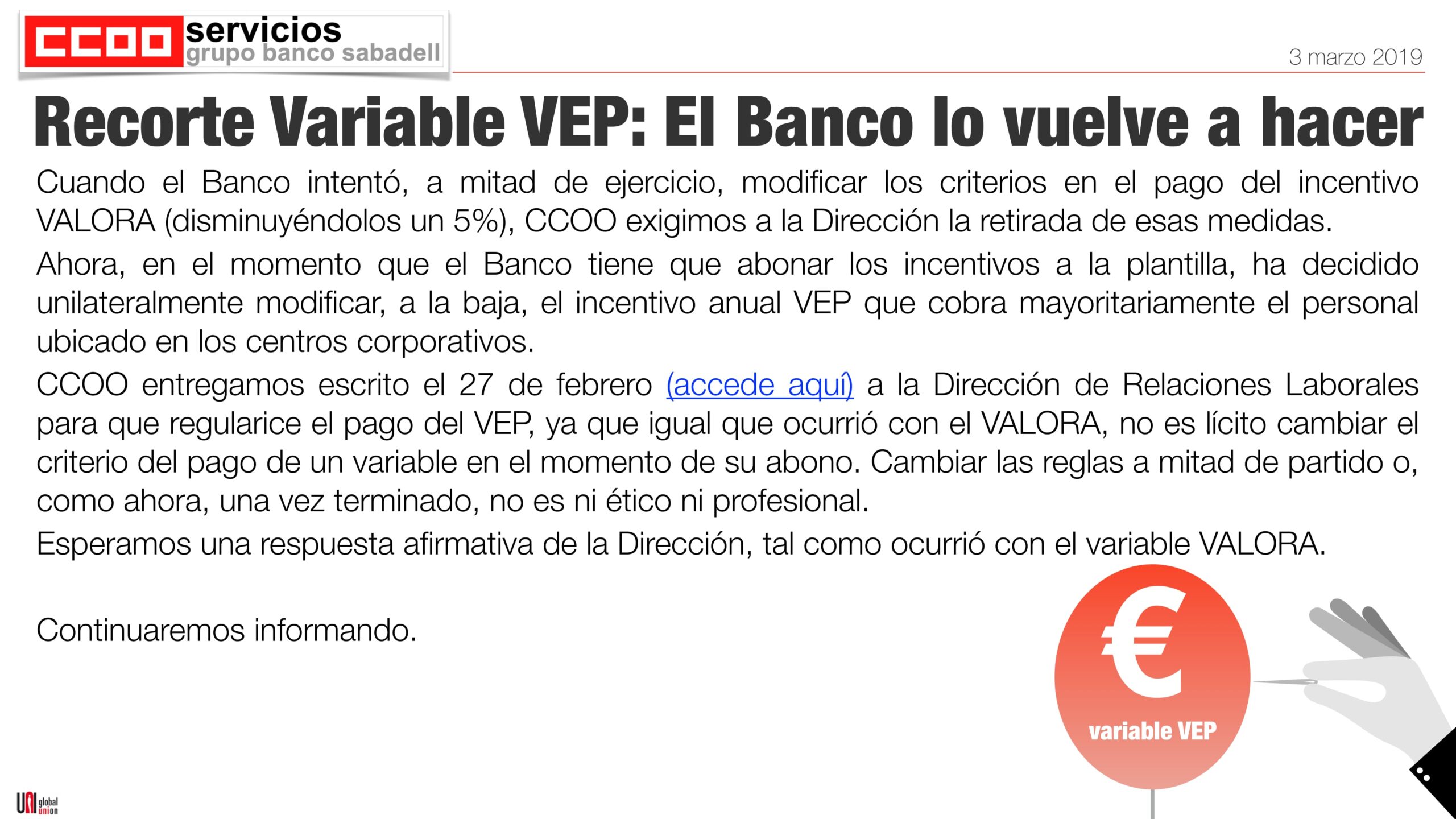 …en el momento que el Banco tiene que abonar los incentivos a la plantilla, ha decidido unilateralmente modificar, a la baja, el incentivo anual VEP que cobra mayoritariamente el personal ubicado en los centros corporativos.