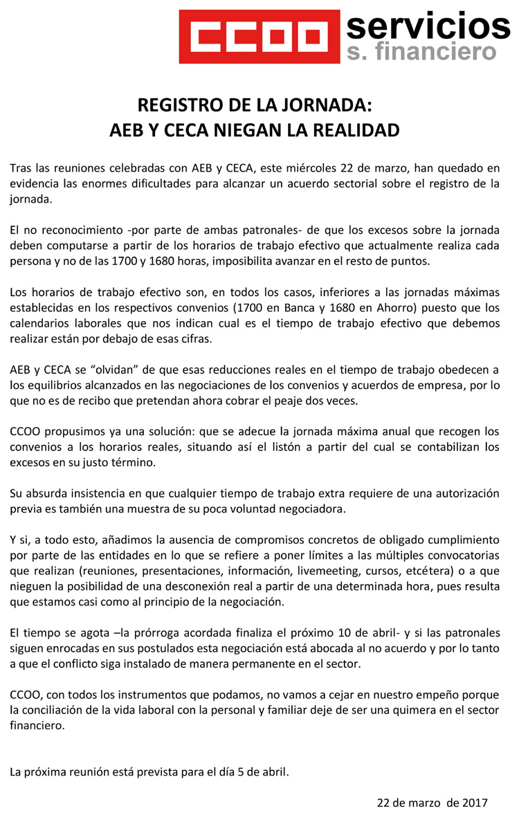 Tras las reuniones celebradas con AEB y CECA, este miércoles 22 de marzo, han quedado en evidencia las enormes dificultades para alcanzar un acuerdo sectorial sobre el registro de la jornada.
