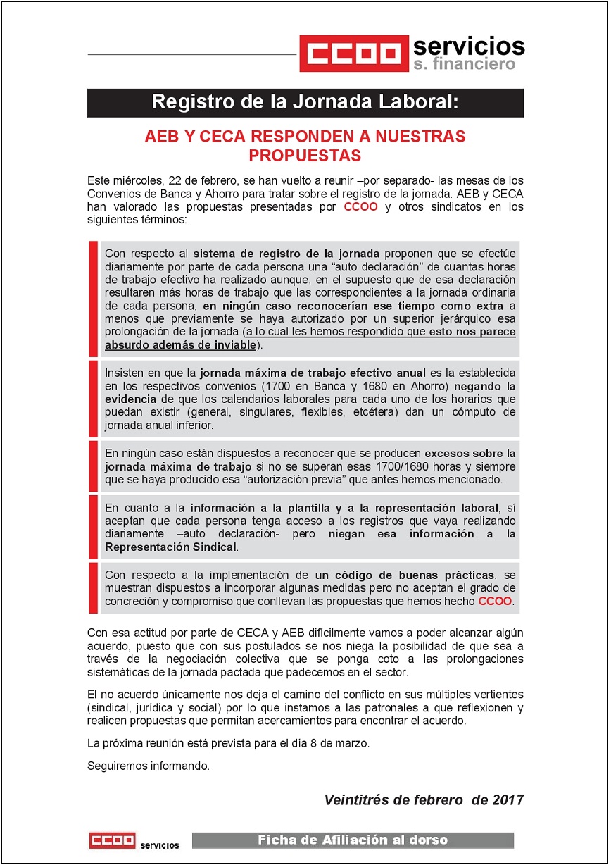 Este miércoles, 22 de febrero de 2017, se han vuelto a reunir por separado las mesas de los Convenios de Banca y Ahorro a fin de tratar negociación sobre el Registro de la Jornada. AEB y CECA han valorado las propuestas presentadas por CCOO y otros sindicatos en los términos que a continuación os detallamos.