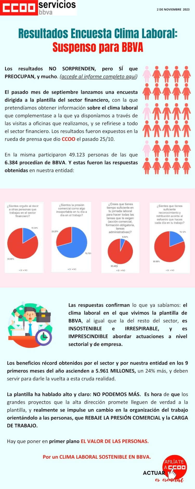 El pasado mes de septiembre lanzamos una encuesta dirigida a la plantilla del sector financiero sobre el clima laboral. Los resultados NO SORPRENDEN, pero SÍ que PREOCUPAN, y mucho.