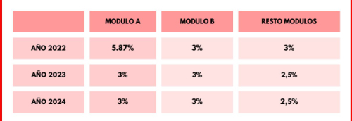 Todo ello representa una subida salarial del 11,80% para el "módulo A" con el objetivo de integrarse en el "módulo B" y una subida del 9% para el "modulo B" y del 8% para el resto de módulos, para los tres años.