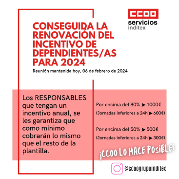 En la reunión de la mesa estatal de negociación con el Grupo Inditex mantenida este martes (06/02/24) se ha conseguido renovar el incentivo de dependientes/as para 2024