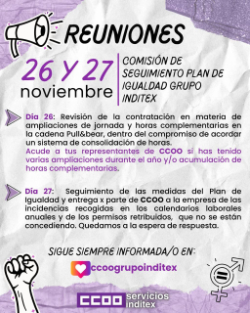 - CCOO informa sobre las reuniones de la Comisión de Seguimiento del Plan de Igualdad en el Grupo Inditex celebradas los días 26 y 27 de noviembre.