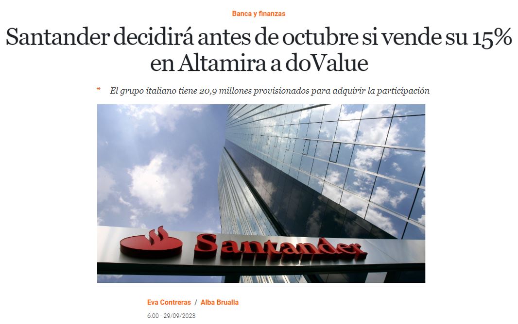 elEconomista – Santander decidirá antes de octubre si vende su 15% en Altamira a doValue