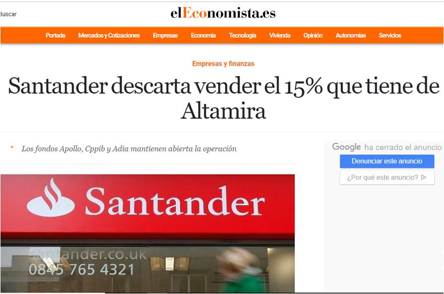 El Economista – Santander descarta vender el 15% que tiene de Altamira