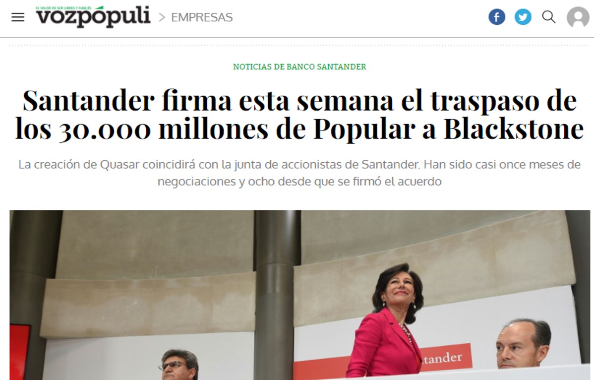 Santander firma esta semana el traspaso de los 30.000 millones de Popular a Blackstone
