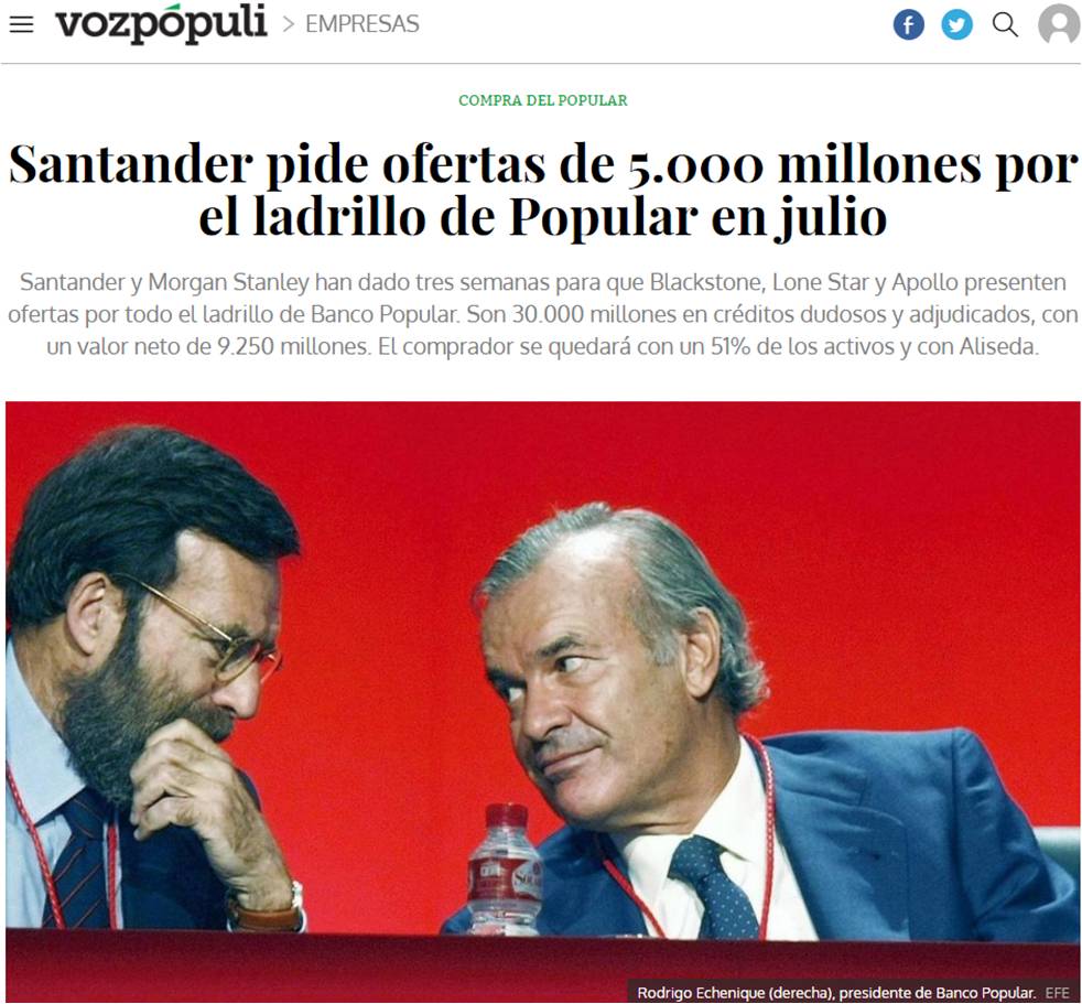 Santander y Morgan Stanley han dado tres semanas para que Blackstone, Lone Star y Apollo presenten ofertas por todo el ladrillo de Banco Popular. Son 30.000 millones en créditos dudosos y adjudicados, con un valor neto de 9.250 millones. El comprador se quedará con un 51% de los activos y con Aliseda.