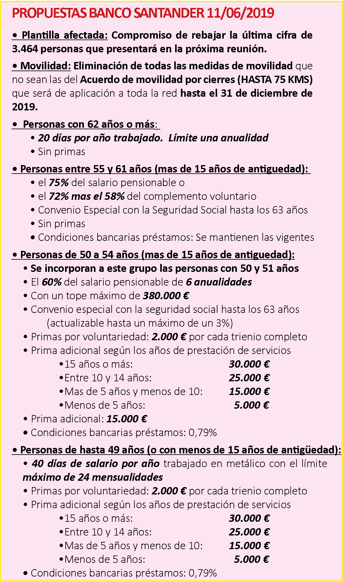 CCOO valora como avances que el Banco haya recogido las peticiones planteadas por CCOO tanto para proteger al  colectivo de 50 y 51 años con su inclusión en el tramo superior, como con la subida de las primas y la rebaja de los plazos para conseguirlas. Quedamos a la espera de la determinación del perímetro afectado final y que Banco Santander ha propuesto presentarlo en la próxima reunión del jueves 13.