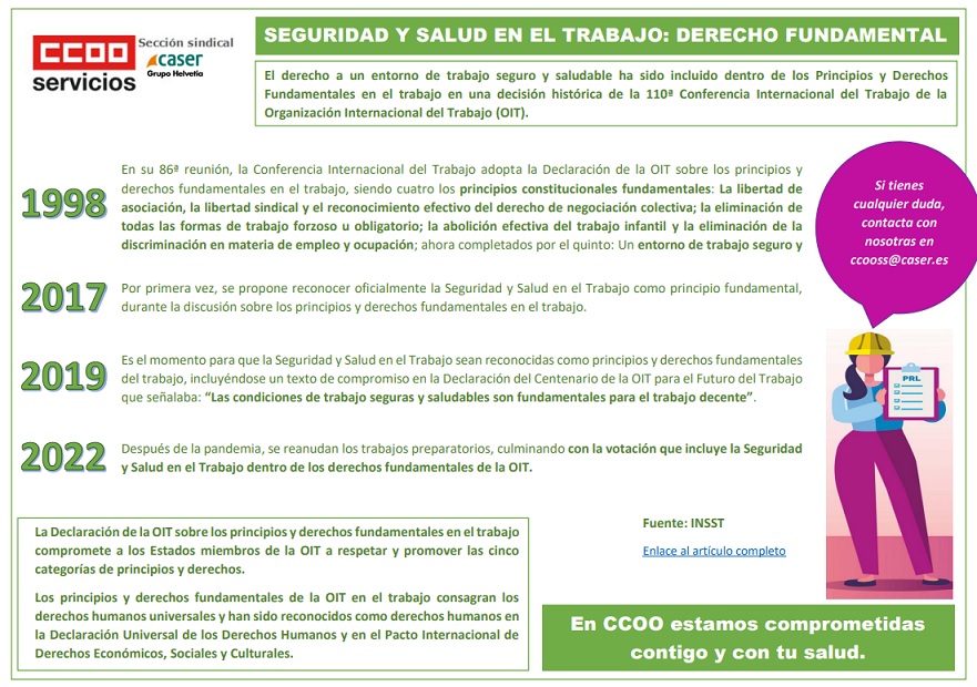 El derecho a un entorno de trabajo seguro y saludable ha sido incluido dentro de los Principios y Derechos Fundamentales en el trabajo en una decisión histórica de la 110ª Conferencia Internacional del Trabajo de la Organización Internacional del Trabajo (OIT).