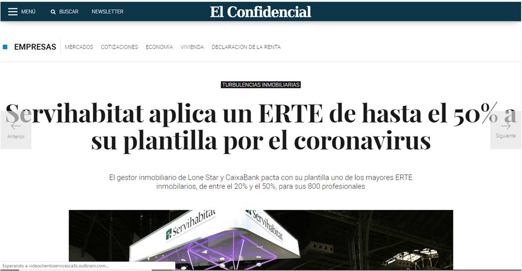El Confidencial – Servihabitat aplica un ERTE de hasta el 50% a su plantilla por el coronavirus