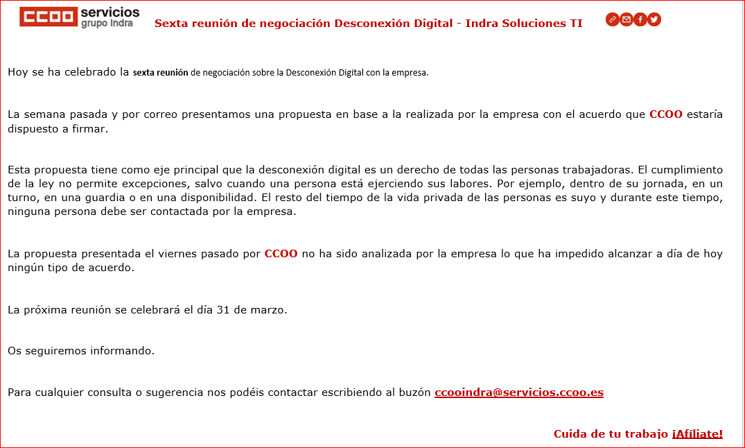Sexta reunión de negociación Desconexión Digital – Indra Soluciones TI