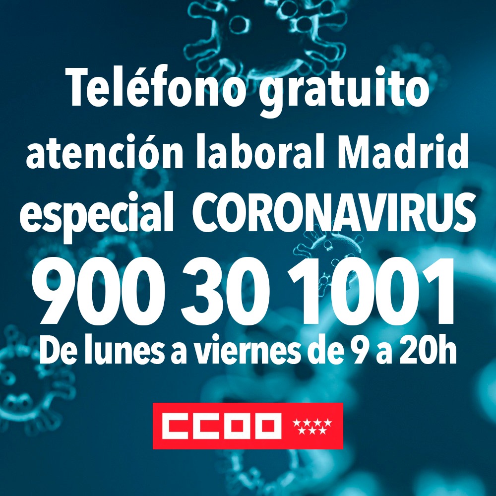 Si trabajas en la Comunidad de Madrid, para facilitarte información por las dudas que seguro te están surgiendo hemos facilitado un teléfono gratuito de asesoría laboral. Nuestra prioridad es ayudarte: 900 30 1001 (de lunes a viernes, de 9h a 20h). Además, también puedes realizar tus consultas por correo: atencioncovid-19@usmr.ccoo.es y encontrar toda la información laboral de la Comunidad de madrid en este enlace: https://madrid.ccoo.es/especialcoronavirus