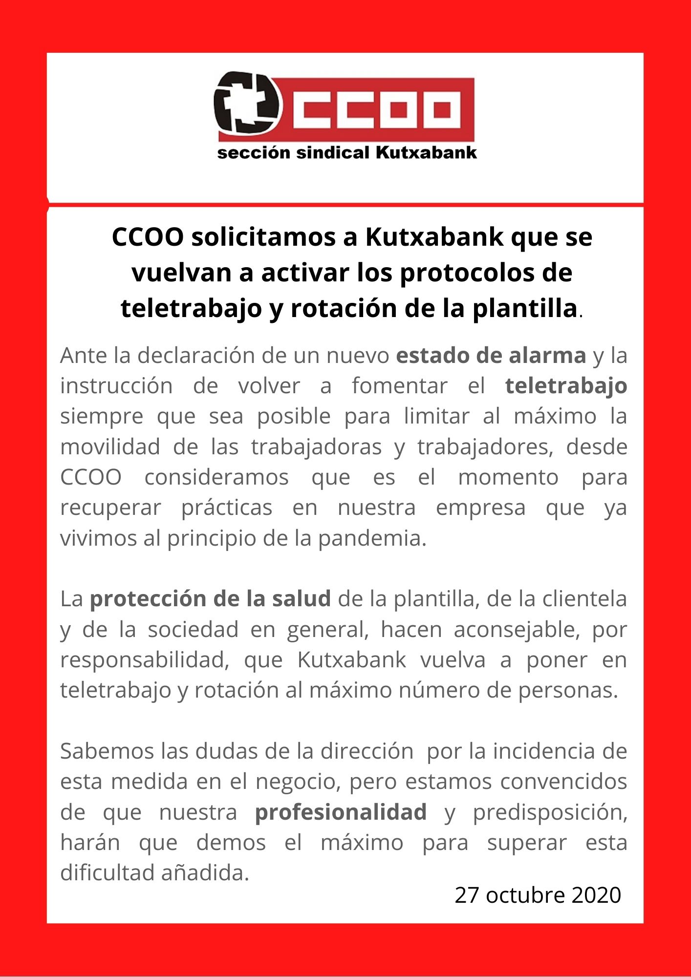 Desgraciadamente el virus está volviendo a golpear con su mayor virulencia. Solicitamos que se vuelvan a implantar las medidas que ya funcionaron en la primera fase de la pandemia.l