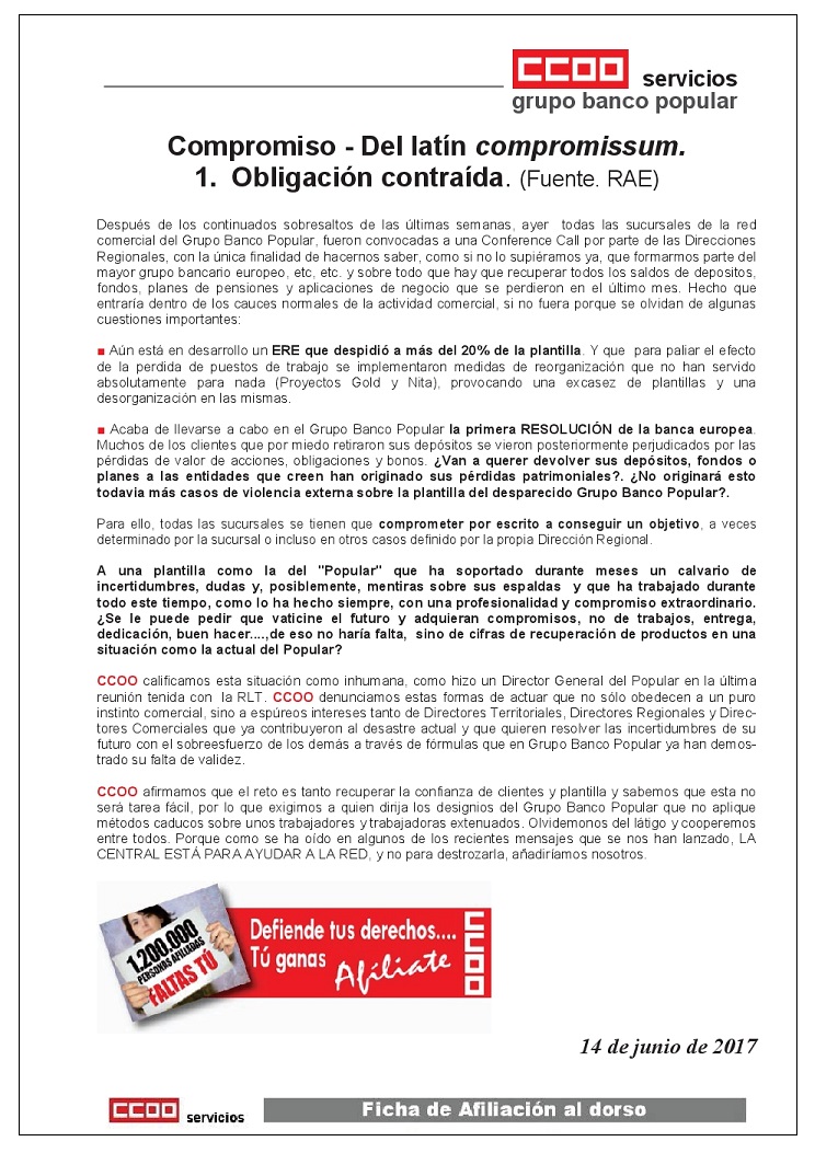Después de los continuados sobresaltos de las últimas semanas, ayer todas las sucursales de la red comercial del Grupo Banco Popular, fueron convocadas a una Conference Call por parte de las Direcciones Regionales, con la única finalidad de hacernos saber, como si no lo supiéramos ya, que formamos parte del mayor grupo bancario europeo, etc, etc. y sobre todo que hay que recuperar todos los saldos de depósitos, fondos, planes de pensiones y aplicaciones de negocio que se perdieron en el último mes.