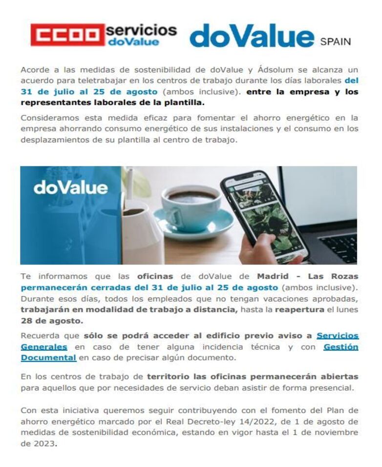 Acorde a las medidas de sostenibilidad de doValue y Ádsolum se alcanza un acuerdo para teletrabajar en los centros de trabajo durante los días laborales del 31 de julio al 25 de agosto (ambos inclusive). entre la empresa y los representantes laborales de la plantilla.