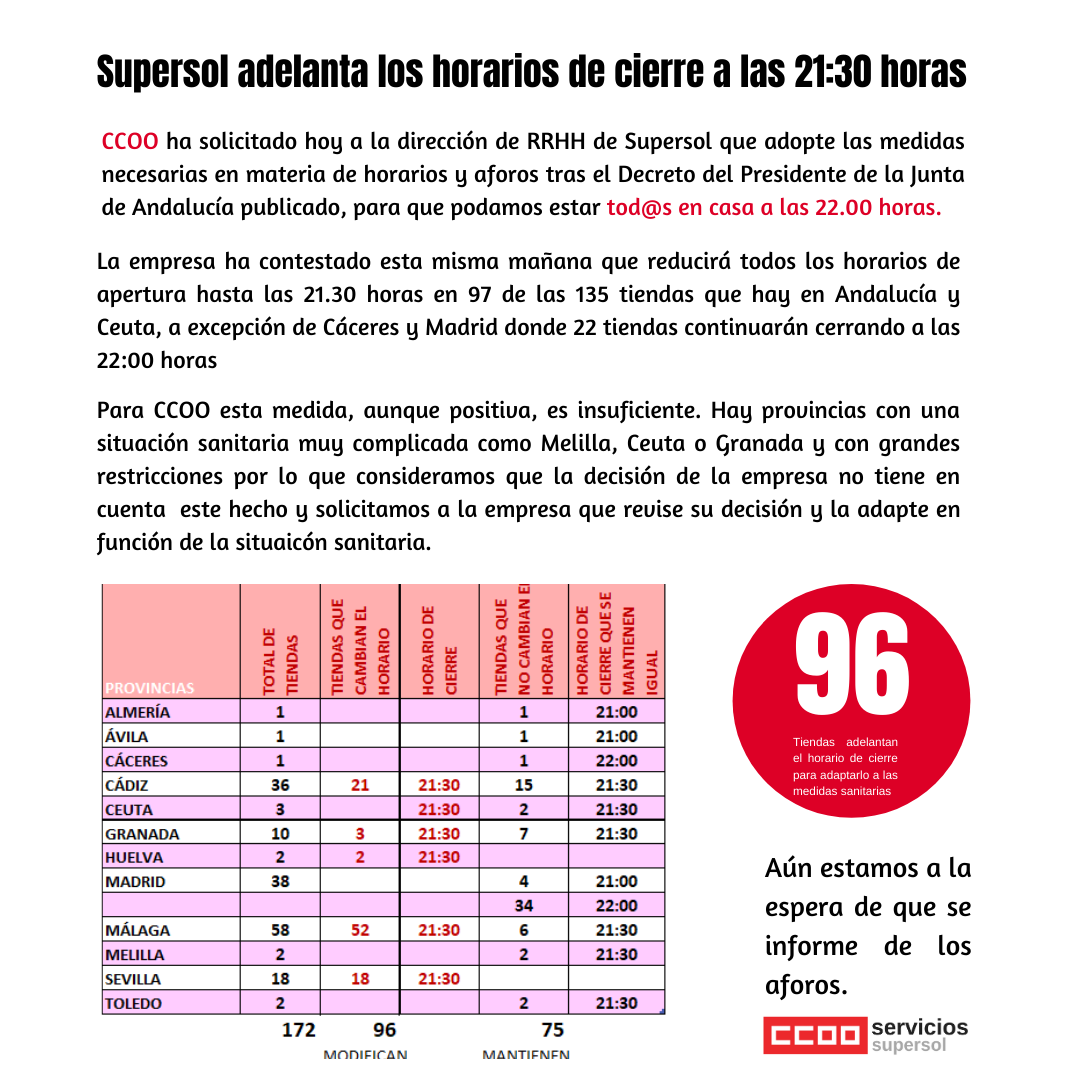 CCOO ha enviado un escrito a la empresa solicitando que adapte los horarios de cierre de las tiendas. La empresa ha contestado adelantando el horario de cierre de 96 tiendas las 21.30 horas. Con esta medida un total de 137 tiendas Supersol adelantan media hora el cierre.