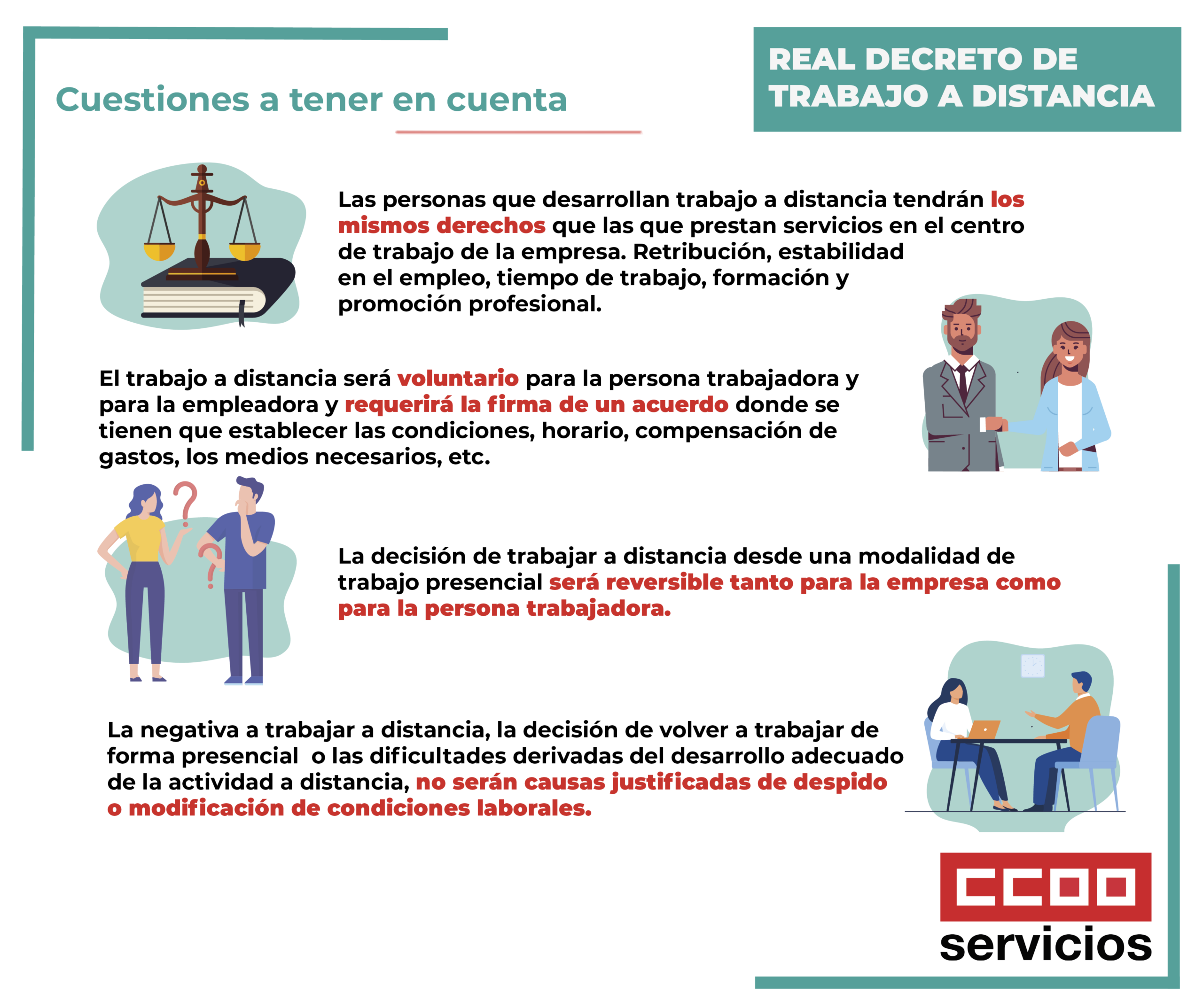 El acceso a esta medida será voluntaria teniendo los mismos derechos y condiciones laborales. Recuerda, estar en casa no significa alargar la jornada ni tener una disponibilidad total.