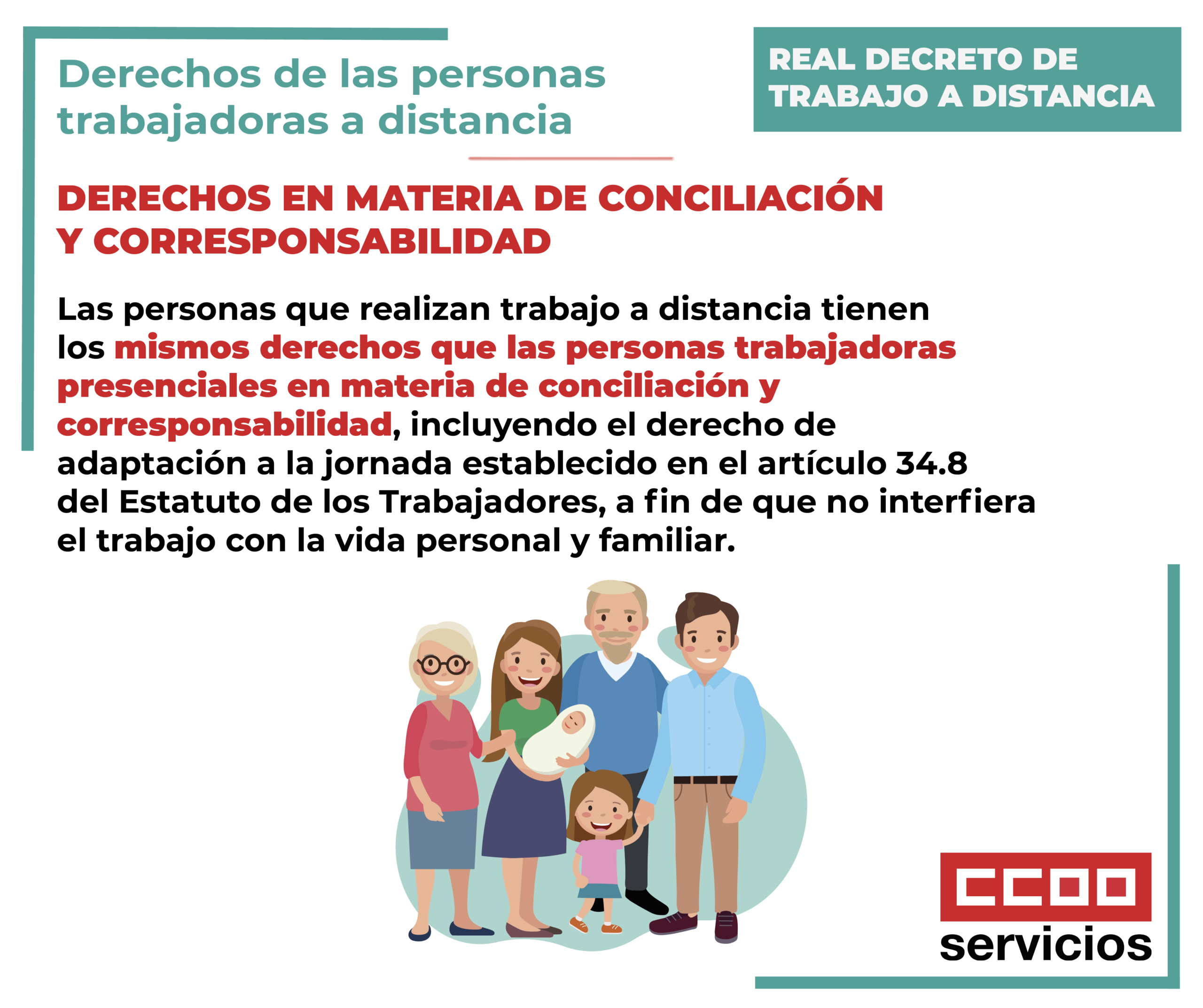 El teletrabajo no debe suponer bajo ningún concepto una traba a la conciliación. En este sentido una persona trabajadora a distancia puede solicitar también y cuando lo necesite las adaptaciones de la duración y distribución de la jornada de trabajo.