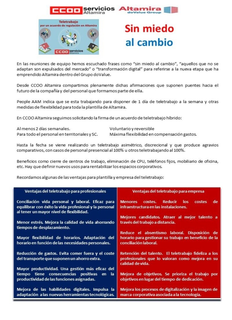 En CCOO Altamira seguimos solicitando la firma de un acuerdo de teletrabajo híbrido: