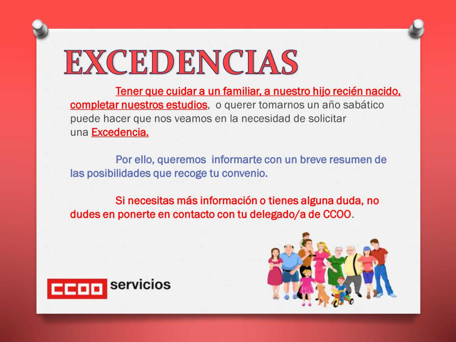 Te informamos en un pequeño resumen gráfico de los tipos de excedencia recogidos en el Convenio de Contact Center. Si necesitas más información o tienes dudas, contacta con tu delegada o delegado de CCOO.