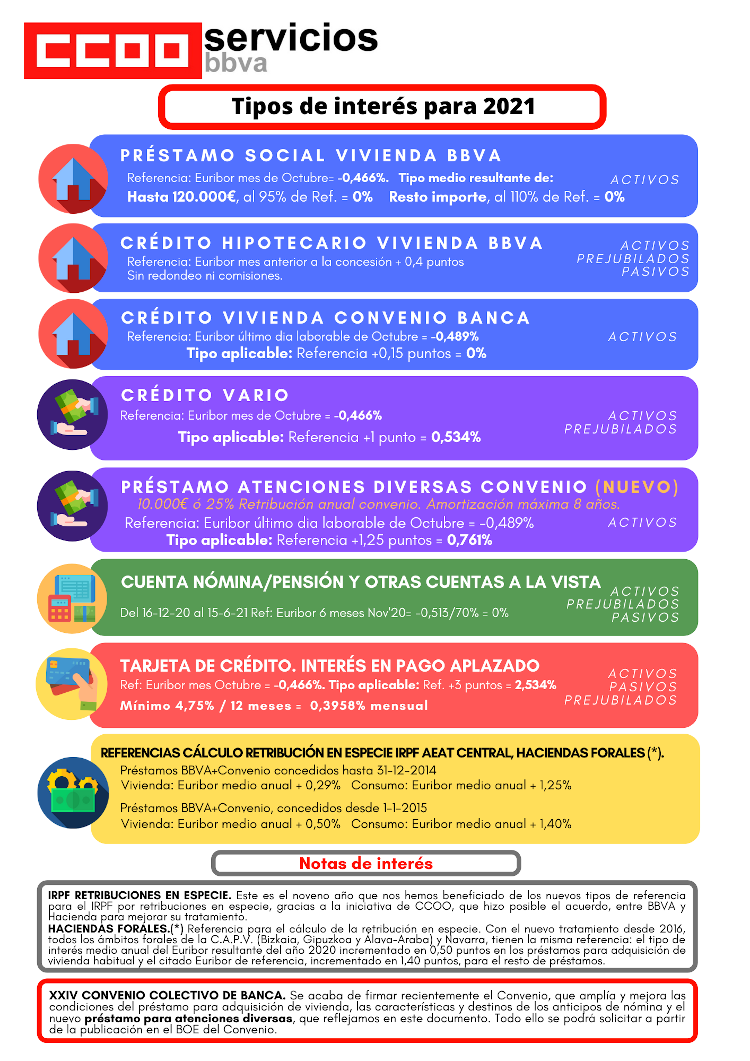 A continuación os detallamos las condiciones de préstamos , créditos y otros productos bancarios para empleados y empleadas de BBVA  para este 2021.