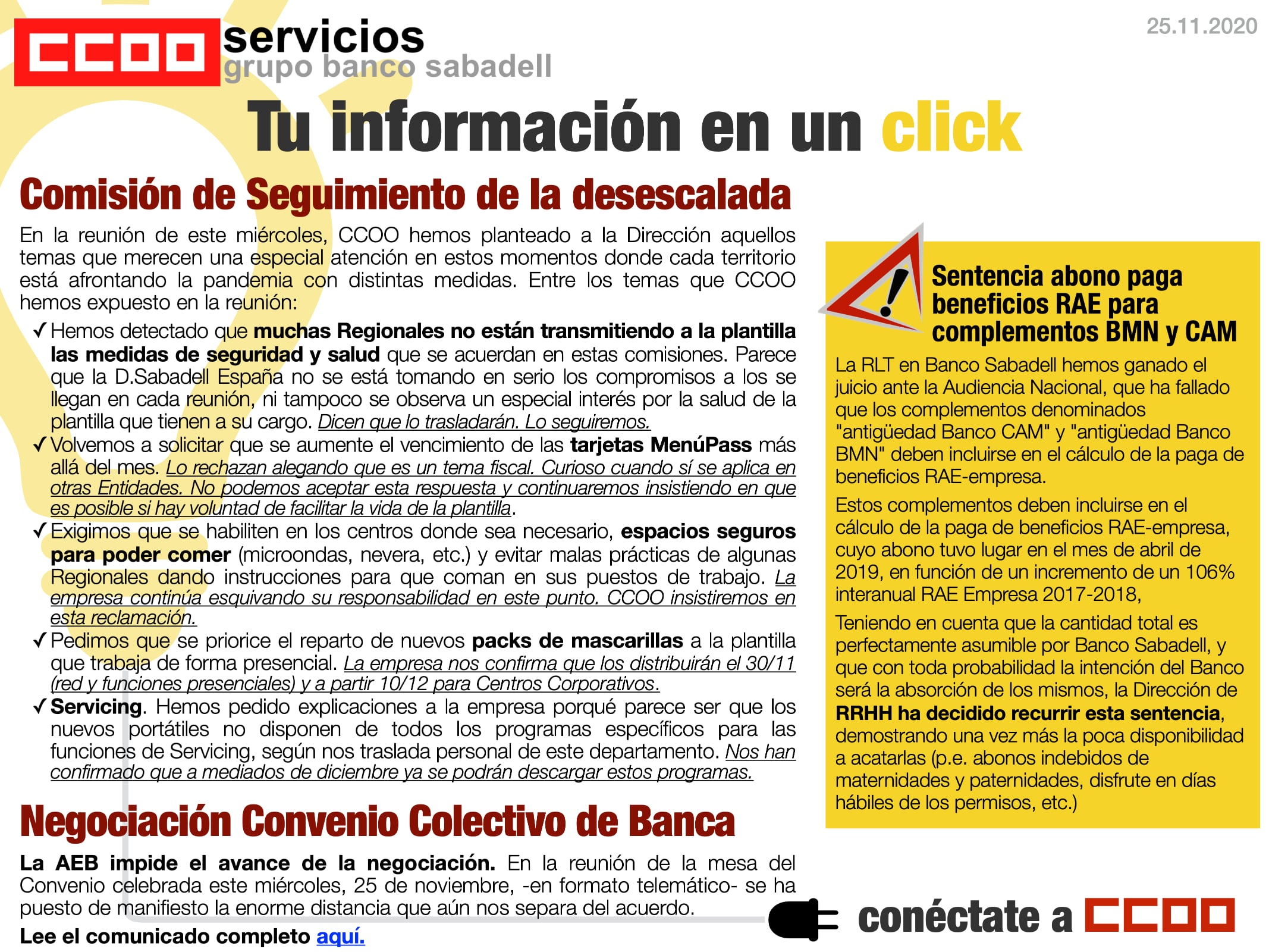 Tu información en un click: Comisión de desescalada, Negociación Convenio y juicio abono RAE empresa