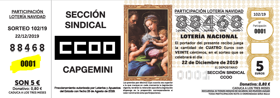 (*)Participaciones para el sorteo extraordinario de navidad que se celebrará el próximo 22 de diciembre de 2019. Precio de la papeleta 5€ participación de 4,20€ y donativo de 0,80€ que se destinarán a acciones sindicales a favor de los trabajadores/as de Capgemini.