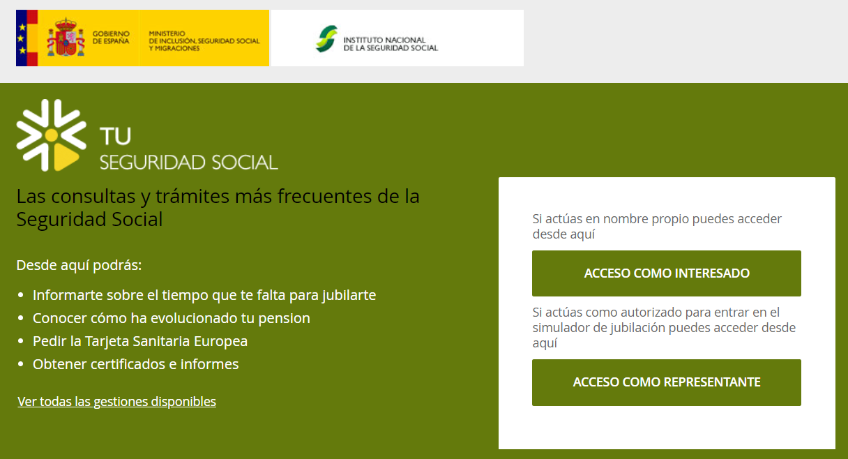 Para acceder a este servicio, al portal Tu Seguridad Social, selecciona si quieres acceder como interesado (en tu nombre) o bien como representante o autorizado de otra persona.