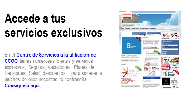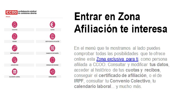 Las personas afiliadas a CCOO tienen un exclusivo acceso a la Zona Afiliación que te ofrece múltiples utilidades y servicios. ¿Has entrado ya? Para entrar necesitarás tu clave de acceso, si no la tienes, solicítala aquí. |
